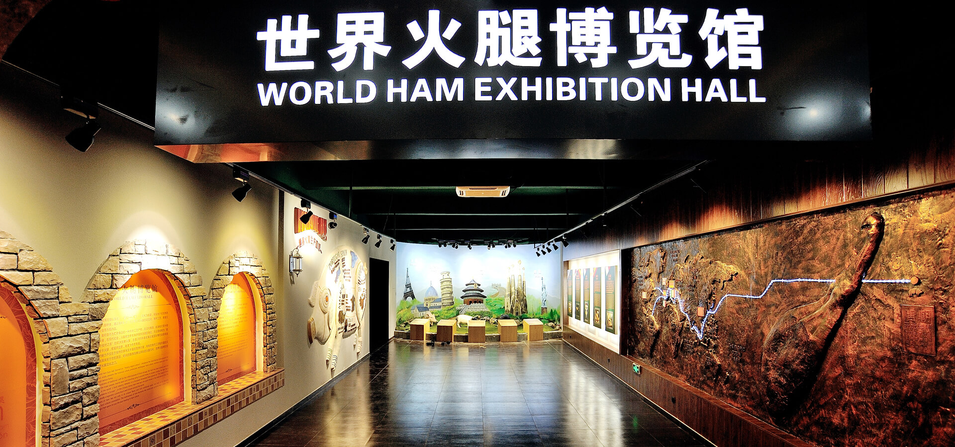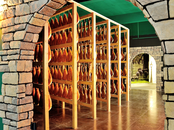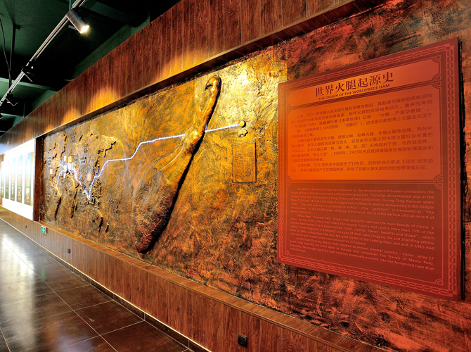 世界火腿博覽館是一個(gè)以世界火腿為主題的博覽館,用歷史-地域-工藝-文化為線索,通過展板、照片、聲光和布景等手法,翔實(shí)介紹了中國金華火腿、西班牙伊比利亞火腿、意大利帕爾瑪火腿、法國科西嘉火腿和巴黎火腿、美國的鄉(xiāng)村火腿等世界知名火腿的歷史人文,消費(fèi)習(xí)俗、制作工藝、火腿美食等。